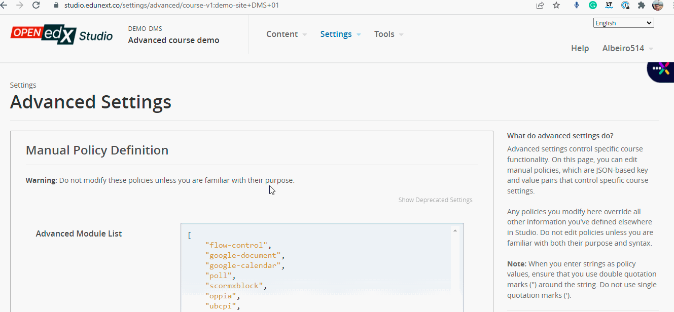 Now that you are preparing your course to be launched, it’s recommended to make the course visible on the homepage —in the case that is not already visible— there are three options to configure the visibility of a course on the LMS site. Go to Studio-Settings-Advanced configurations and locate the property Course Visibility In Catalog.